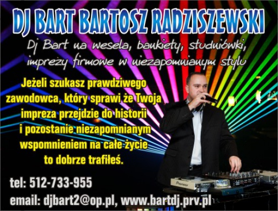 Dj Bart Bartosz na Twoje wesele i każdą imprezę(bankiet, poprawiny, studniówka, sylwester)! Zapraszam na www.bartdj.prv.pl tel.512-733-955