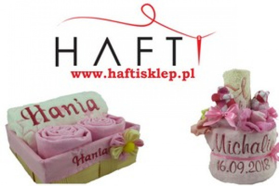 Firma HAFTI oferuje profesjonalne usługi hafciarskie wykonywane metodą haftu komputerowego. Usługi haftowania firma HAFTI wykonuje na dowolnych materiałach dostarczonych przez Klienta lub produktach dostępnych w sklepie internetowym www.haftisklep.pl. Oferta firmy HAFTI obejmuje wykonywanie personalizowanych produktów reklamowych, upominków oraz prezentów na różne okazje. W ofercie sklepu internetowego prowadzonego przez firmę HAFTI dostępne są personalizowane wyprawki niemowlęce z możliwością wyhaftowania dowolnego tekstu i elementu graficznego. Produkty z haftem dostępne w sklepie internetowym HAFTI są doskonałym pomysłem na prezent dla noworodka z okazji narodzin, Chrztu Świętego czy Świąt Bożego Narodzenia. Wszystkie elementy wyprawki niemowlęcej mogą być ozdobione haftem ze wspólnym motywem lub posiadać różne napisy, wzory czy kolory. Na specjalne okazje związane z narodzinami dziecka firma HAFTI przygotowuje torty niemowlęce z dowolnie wybranych artykułów z oferty artykułów dziecięcych dostępnych w sklepie www.haftisklep.pl. Firma HAFTI wykonuje torty niemowlęce skomponowane z bogatej oferty produktów dostępnych w sklepie internetowym: body niemowlęce z haftem, śliniaczki z haftem, kocyki z haftem, misie pluszowe z wyhaftowanym tekstem, imieniem dziecka czy datą urodzenia. Firma HAFTI wykonuje haftowane metryczki niemowlęce w ramkach, które są oryginalną pamiątką oraz elementem dekoracyjnym pokoju dziecka. Wszystkie produkty dla niemowląt oraz dzieci dostępne w ofercie sklepu internetowego HAFTI posiadają stosowne certyfikaty bezpieczeństwa, gwarancję najwyższej jakości oraz pochodzą od polskich producentów.